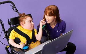 One of the tools that Lyla and Rebecca have been using is Clicker software, a program that allows Lyla to engage with literacy and school-based activities at her pace. Using the Clicker software shows that there are different ways to access curriculum in addition to pencils and keyboards that give Lyla the opportunity to explore literacy and communication and develop her skills.