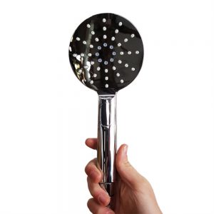 Adjustable 7.5 litres per minute push button shower head with multiple settings including soft, pulsating and bubble spray.