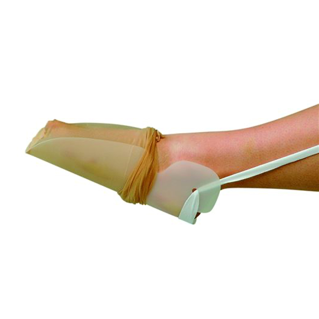 It consists of a strong, shaped, flexible plastic gutter with long cotton tapes attached to the top. The stocking or sock is fed on to the plastic and held in place with the side notches. The foot is put in the open end of the stocking, which is then pulled over the foot and up the leg using the tapes.