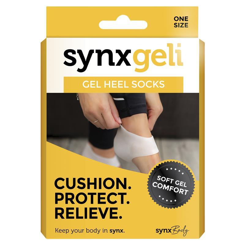 The Synxgeli Gel Heel Socks provide a barrier for any bony deformities at the back of the heel that may be aggravated when wearing shoes as well as protecting against cracked heels.