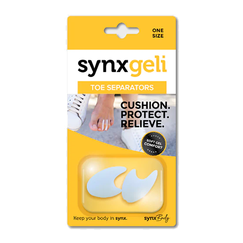 Synxgeli Big Toe spreaders have been specifically designed to separate the first and second toes, therefore reducing friction, pressure and corn and callus formation. They cushion, protect and relieve soft tissue and the first and second toes from unwanted stress, providing optimal comfort and pain relief. Cushion. Protect. Relieve.