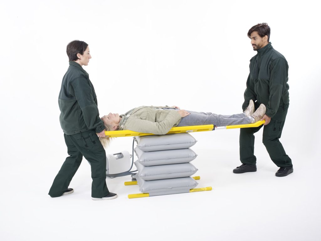 If someone falls over and they can shuffle on to the cushion or be rolled on from the recovery position and assisted to sit upright then the Elk can then be inflated at the touch of a button with someone supporting the individual from behind to bring them to a raise seated position ready to stand.