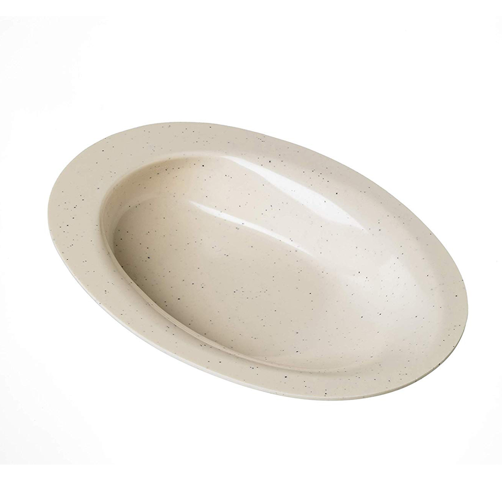The Manoy Contoured plate is an oval mealtime plate with a sloping bottom. It has been designed for one handed use or for those who have difficulty picking up food with utensils.