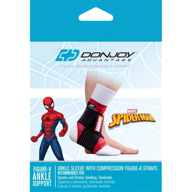 Designed to help protect the ankle from sprains and strains, the DonJoy® Advantage Figure-8 Ankle Support Featuring Marvel helps provide mild ankle support, breathability and compression. Constructed with figure-8 strapping, this wrap-around and slip-on style ankle brace helps stabilize the ankle and aids to prevent ankle rolling or other injuries. The lightweight, low-profile and open-heel design ensures comfortability and an anatomical fit. Easy to put on, the Kids Figure-8 Ankle Support can be worn on the right or left foot and fits in most shoes.