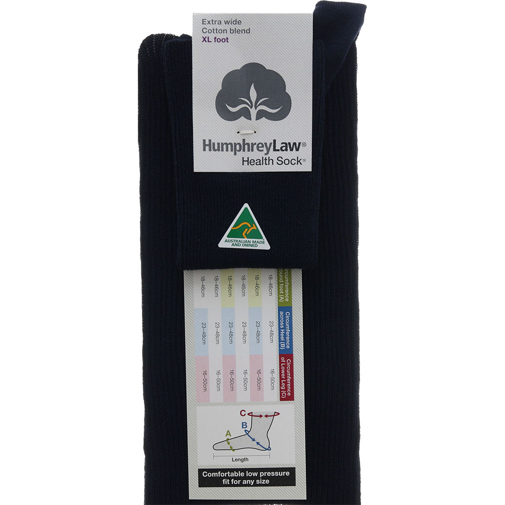 An extra large sock knitted with a 1 X 1 rib for extra sideways stretch to suit a 14+ shoe. Absorbent and breathable mercerised cotton combined with fine elastane throughout gives an elegant smooth fit. Light to medium weight for year-round wear. A Health Sock® with no tight elastic top.