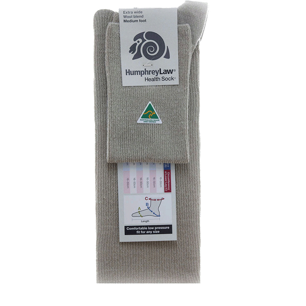 This extra large sock is a soft Health SockĀ® made with fine merino wool blended with nylon for a long life. It is knitted with a rib to allow extra stretch around the foot and leg and to provide a firm fit so that the sock does not slip or become baggy. Extra large socks are knitted wider than a normal sock to fit larger feet which are usually wider or bulkier. As socks are a knitted fabric, when they are stretched width-ways the sock necessarily becomes shorter. Minimum leg and foot pressure is achieved by using twisted wool/nylon for stretch instead of elastane. This is a hardwearing sock suitable for year-round wear.