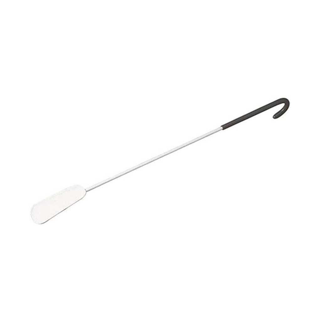 Sturdy long white epoxy coated steel shoehorn for easier reaching.