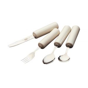 The Queens Cutlery Set is a range of stainless steel utensils mounted into a built-up plastic handle to support those with weak or restricted grip.