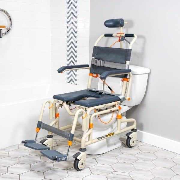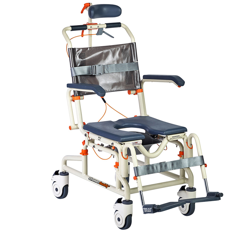 The ShowerBuddy Roll-in Tilt is a full featured bathing solution for users with an accessible or roll-in shower. Designed to help carers shower users with greater comfort and ease. Its tilt function alleviates pressure from a seated position, provides better access during bathing and simple and safe transfer to and from the roll-in shower at home.