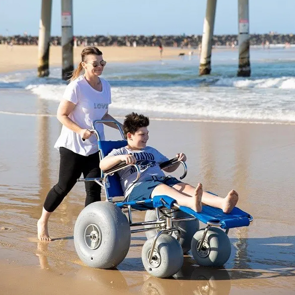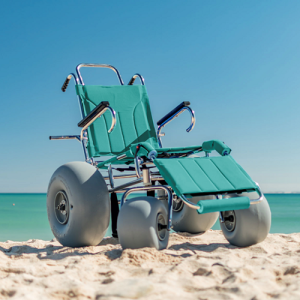The Sandcruiser All Terrain Beach Wheelchair glides smoothly over sand, grass, mud, gravel and small rocks, making it great for outdoor adventures. Special soft and pliable wheels give a smoother ride on beaches, trails, sports fields and other challenging terrain.