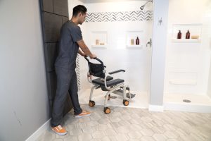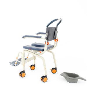 The ShowerBuddy Roll-In Lite is designed for easy transfer of mobility impaired users in and out of roll-in showers. A carer can securely roll a user into the shower, lock the unit to the floor and provide showering assistance issue free. When not required for showering the ShowerBuddy Roll-In Lite can support users with toileting as it fits over most regular bathroom toilets.