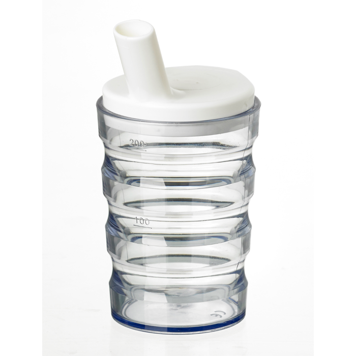 A clear plastic cup with grooves to provide a better grip. The drinking lid has a valve that virtually eliminates spillage. The lids come with small or large apertures for thin and thick liquids. The cup is suitable for warm and cold liquids.