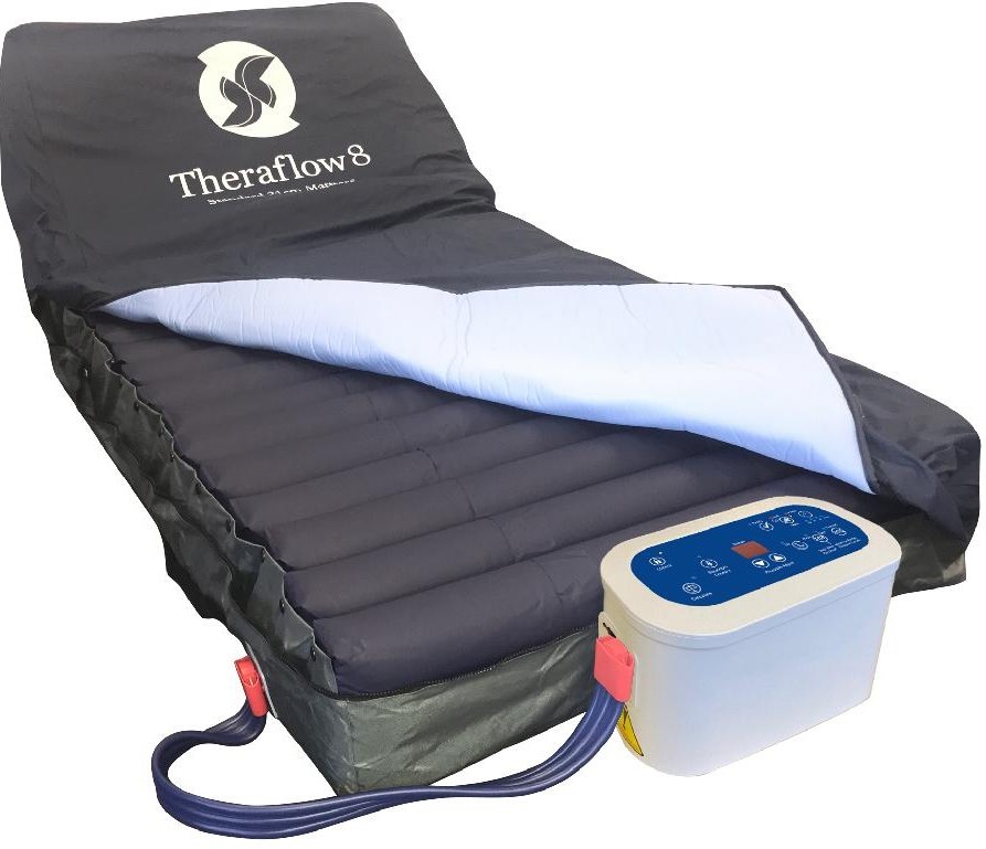 The Theraflow 8 Alternating Mattress represents a quantum leap in active air support. Instead of inflating under the toes first, our Direct Injection technology applies and releases the pressure directly where it is needed the most, under the patient’s high risk sacrum. It’s compact, powerful yet almost silent control unit can quickly support patient loads of up to 200kg whilst alternately allowing pressure to be released across the rest of the body. option which allows for full support and therapy in the upright position!