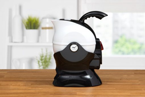 The Uccello Tipping Kettle is an all in one non-weight bearing kettle and tipper. The weighted base arcs on a rotating axis to deliver hot water safely and easily without being removed from the cradle.