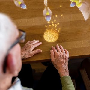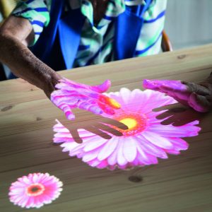 Tovertafel projects interactive games and vibrant images onto a surface. The specially crafted games respond to the hands and arms of players with the goal of providing joy and engagement while serving as a purposeful activity.