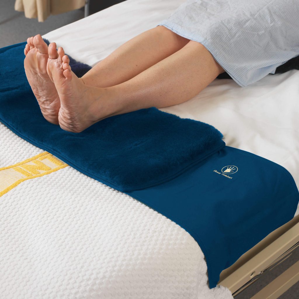 The Shear Comfort Pressure Care Assistant attaches securely by means of linen flaps which can be tucked in under the mattress at the position required to bring the wool protection and comfort to the part of the body selected, be it the feet, knees, pelvic area, shoulders, or head